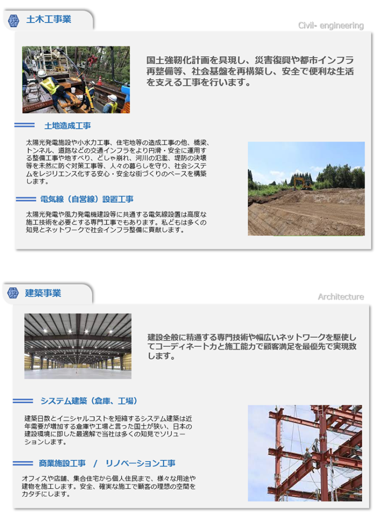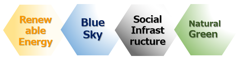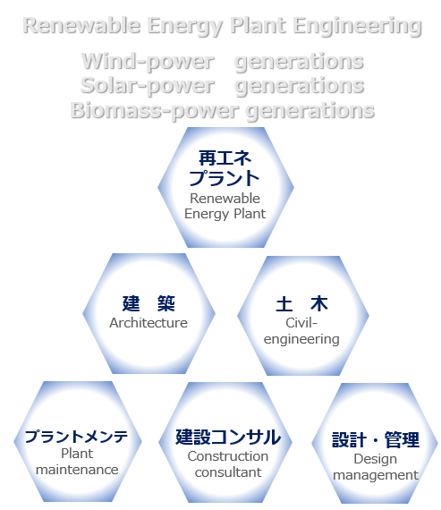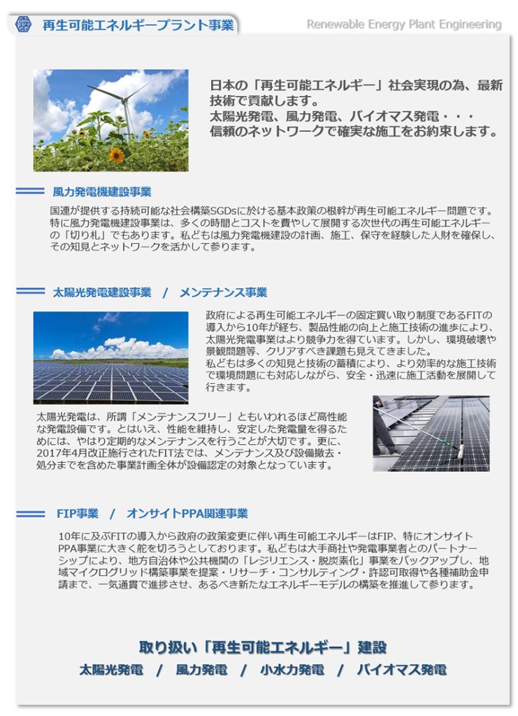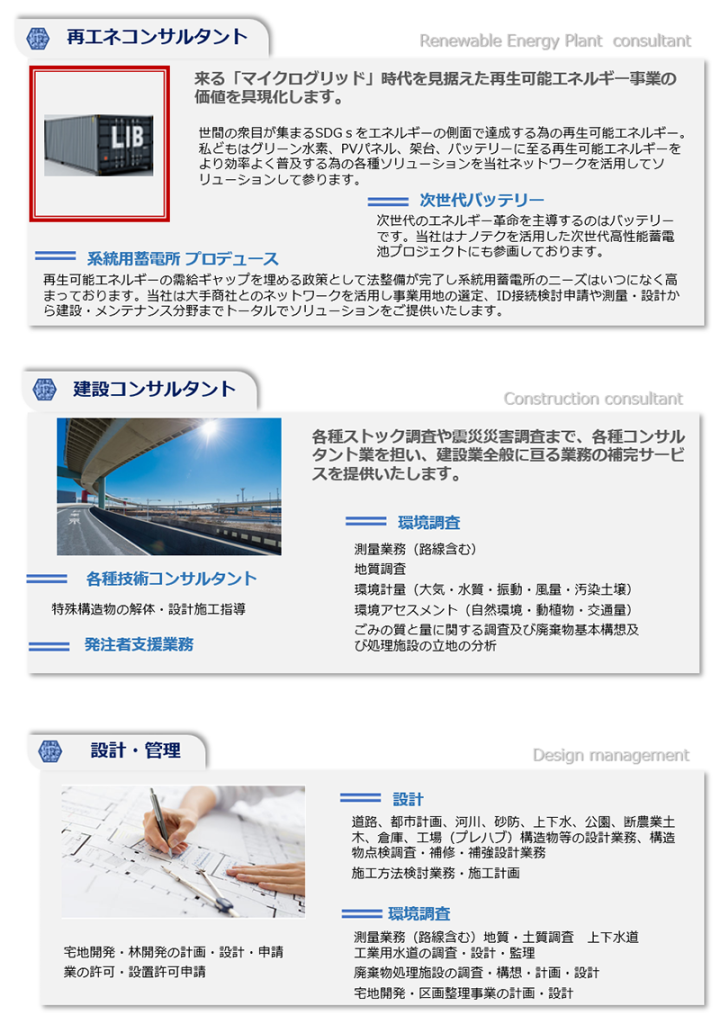 世界を取り巻く不確実性は益々、社会に於けるエネルギーの「革新」を必要としております。 地球温暖化の影響で甚大化する自然災害から社会生活を守り、迅速な復興を目指す国土強靭化計画等、私どもは限りある資源の中で太陽光発電、風力発電機建設事業と言った再生可能エネルギー関連建設業務に於けるコンサルティングや系統用蓄電所に関するすべての業務推進に必要なソリューションを一気通貫で提供し、日本に於ける新しい社会インフラを構築する為、日々研鑽をしてまいります。
